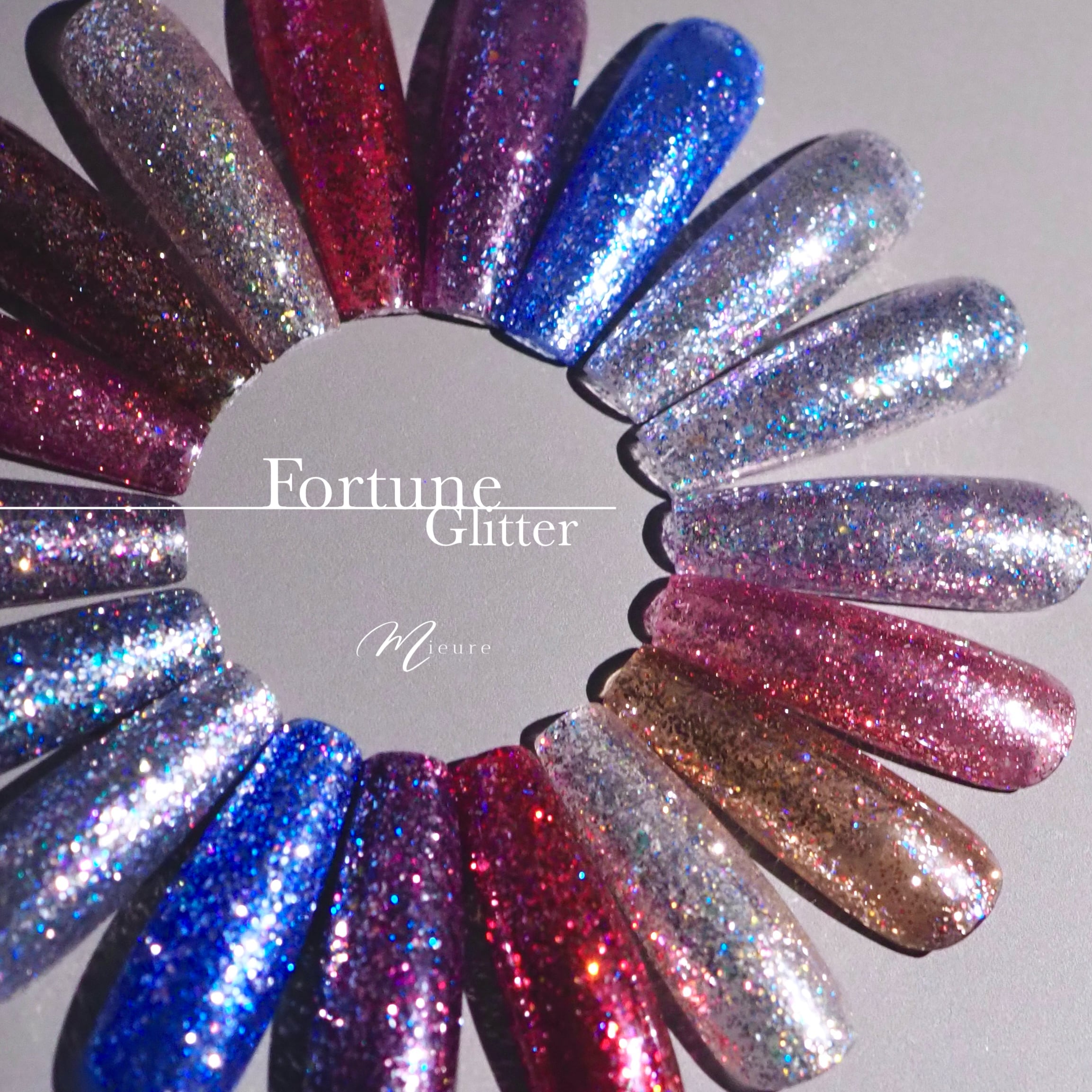 Fortune Glitterは純度の高いクリアカラーに、たっぷりの大粒グリッターと偏光オーロラが眩しいほどに輝くシリーズ。フラッシュではないので、どんな光の下でも最大限の煌めきを放ちます。大粒でありながら薄い材質のグリッターの為、爪にフィットしやすくコーティングをつるんと仕上げやすいのも大きな特徴です。