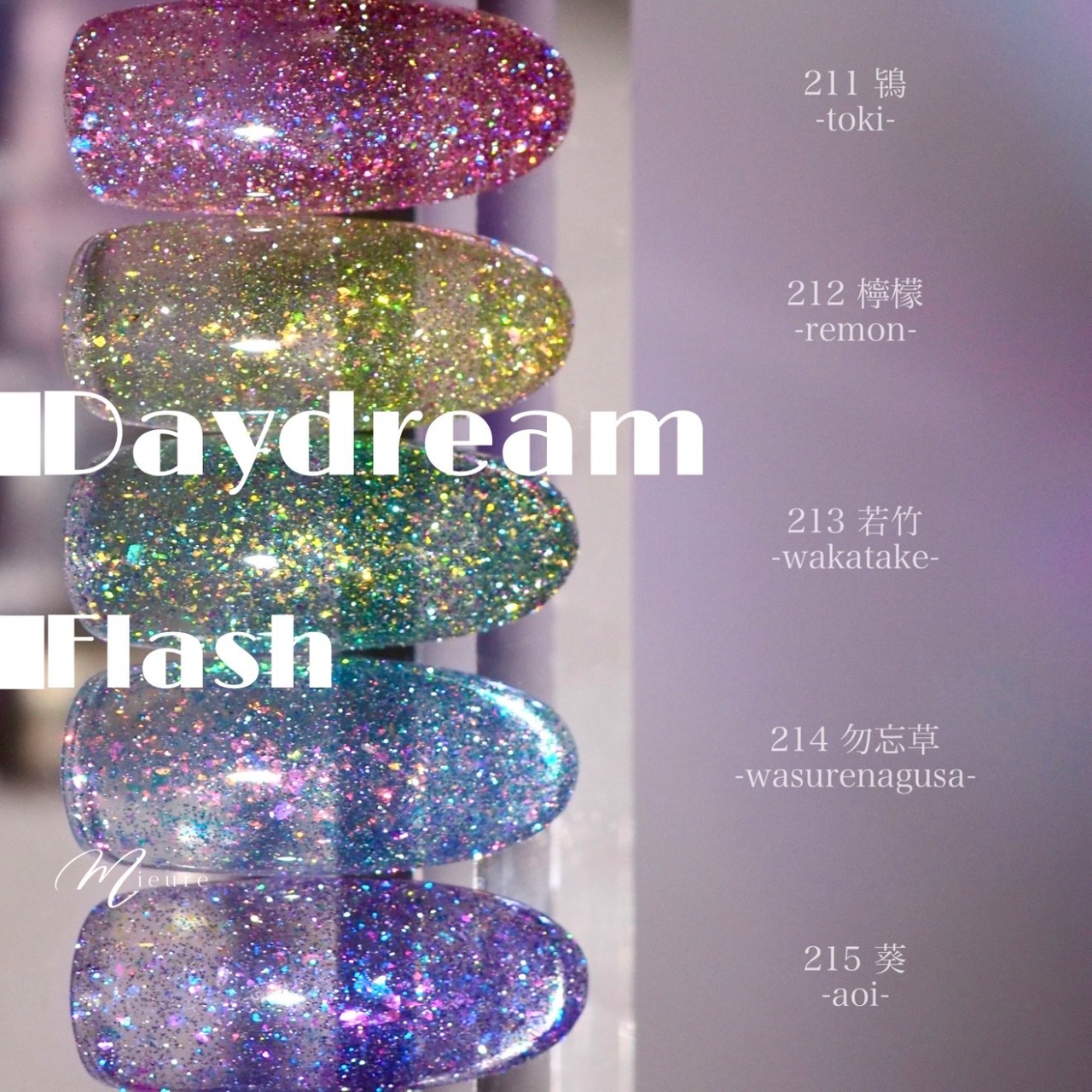 Daydream Flashはフレーク状の偏光グリッターと強い輝きのフラッシュグリッターを、クリアなパステルカラーにたっぷりと閉じ込めたシリーズ。「塗る宝石」をイメージした奥行き感のある輝きは、まさに白昼夢を見たような非現実的な幻想の世界に導かれるよう。強い透明感のみずみずしいカラーの中で、たっぷりのグリッターとフラッシュが宝石のカットのようにとめどなく煌めきます。