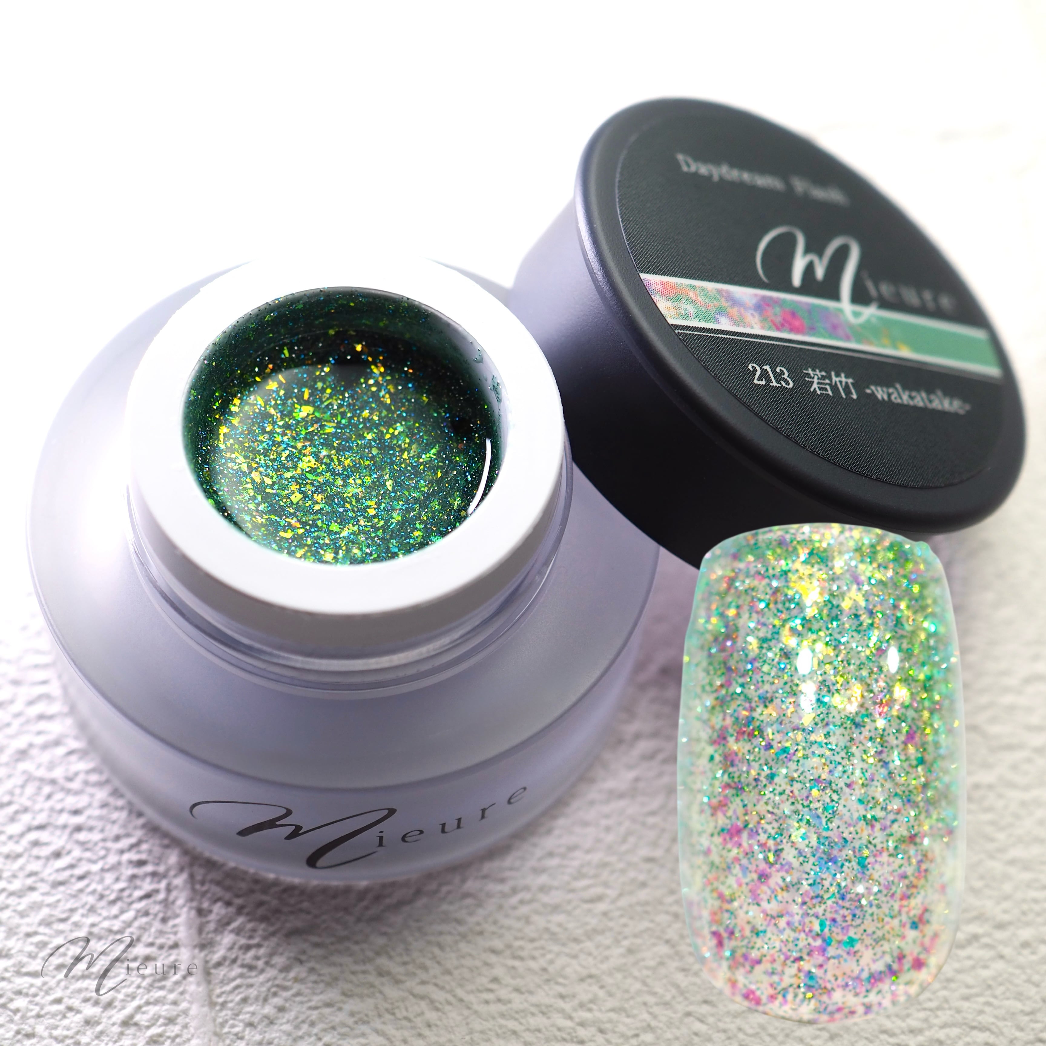 ライムグリーンやターコイズ、ゴールドに輝くフレークとたっぷりのフラッシュパウダーが宝石のように輝きます。