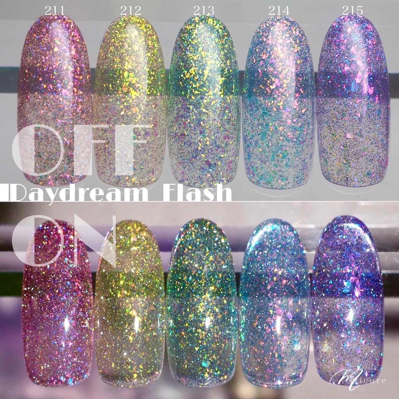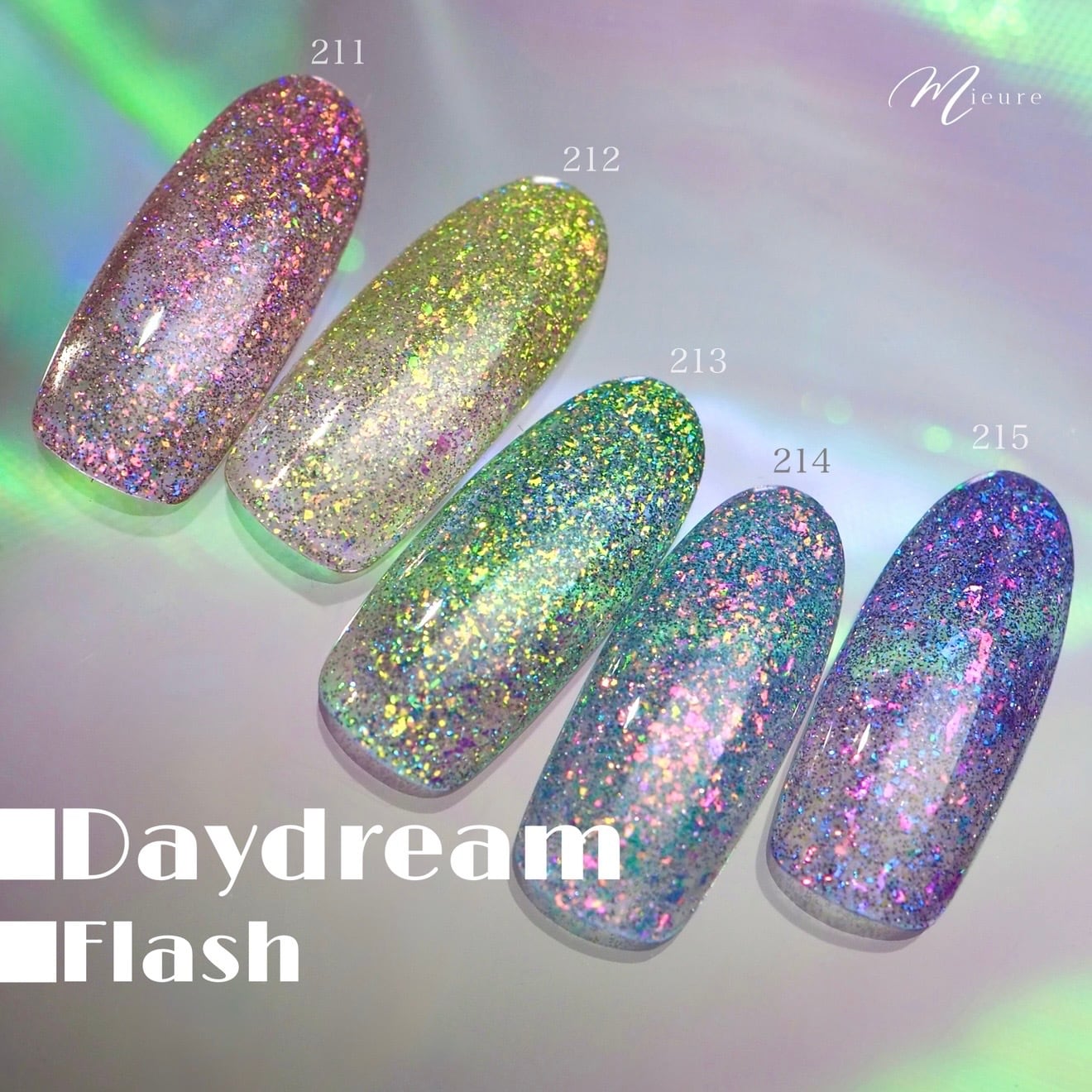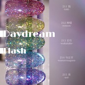 Daydream Flashはフレーク状の偏光グリッターと強い輝きのフラッシュグリッターを、クリアなパステルカラーにたっぷりと閉じ込めたシリーズ。「塗る宝石」をイメージした奥行き感のある輝きは、まさに白昼夢を見たような非現実的な幻想の世界に導かれるよう。強い透明感のみずみずしいカラーの中で、たっぷりのグリッターとフラッシュが宝石のカットのようにとめどなく煌めきます。